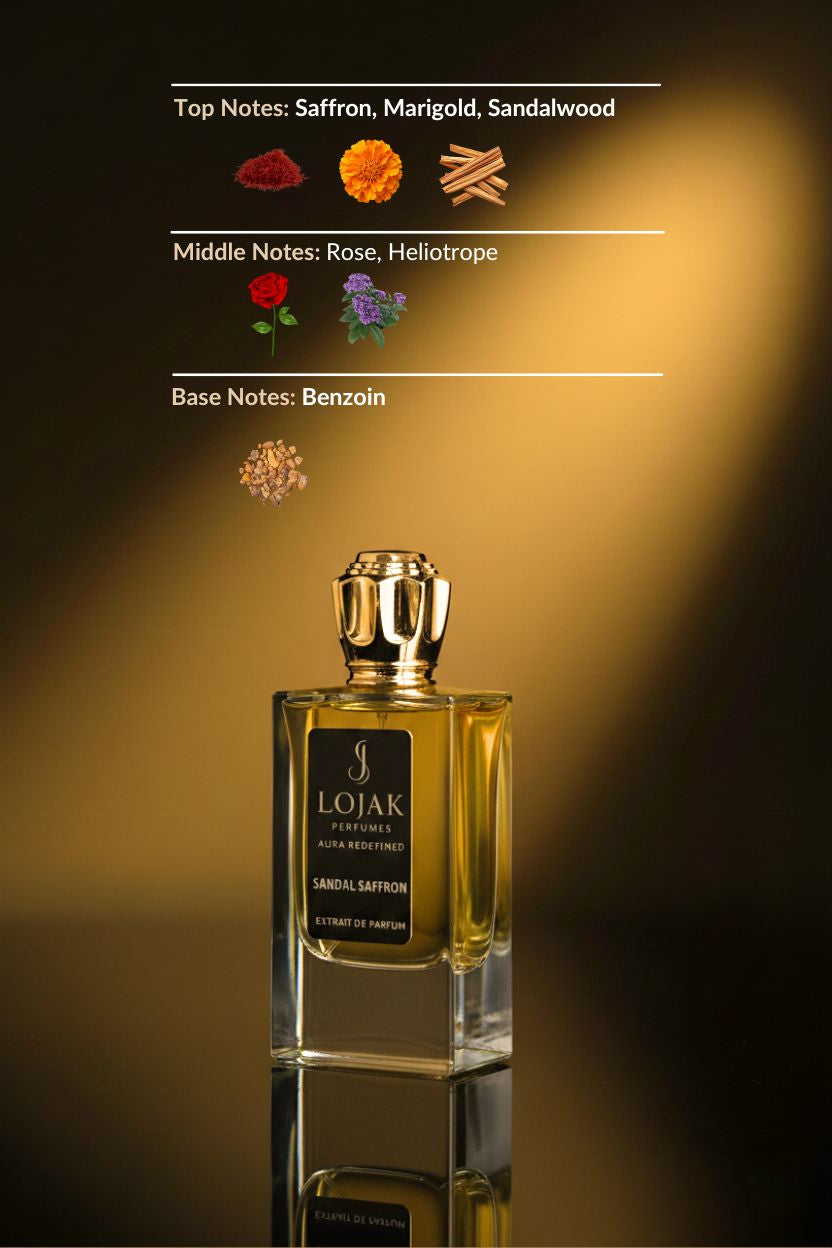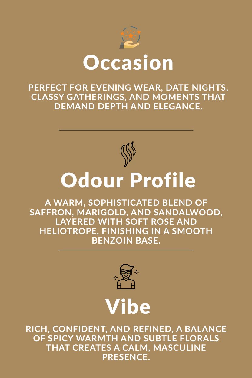 Sandal Saffron unveils a warm, luxurious journey opening with rich saffron, marigold, and creamy sandalwood. The heart blooms into soft rose and heliotrope, before settling into a comforting benzoin base. A refined blend that evolves gracefully on the skin, creating a signature that is elegant, warm, and irresistibly smooth.
